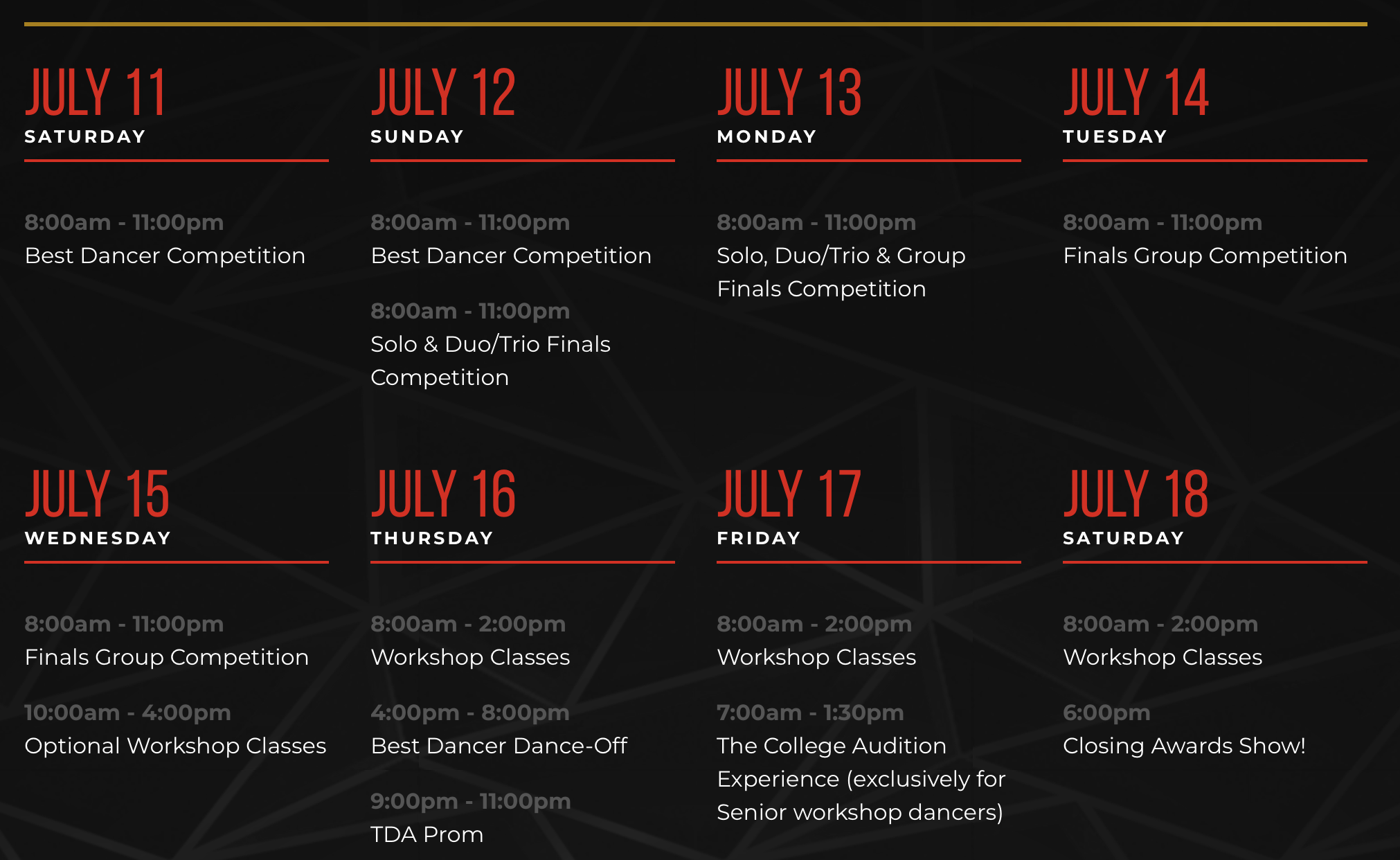 This page serves as the pre-registration for The Dance Awards (TDA) Orlando 2026, one of the most prestigious national dance events in the country. The Dance Awards brings together elite dancers from across the U.S. for an unforgettable week of world-class training, performance opportunities, and inspiration—taught by some of the best choreographers and educators in the industry.